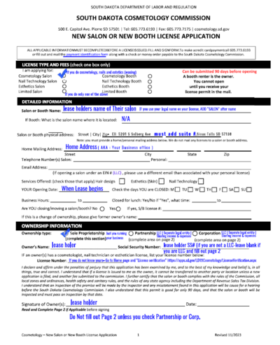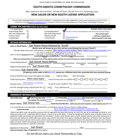 You are a sole Proprietorship (unless you have an LLC). If you are the sub-leaser and applying for a booth license, be sure to use your own information (your name, personal license number, and home address under Owner)—not the suite owner’s info. This can be confusing, under “owner” section, the booth renter would fill out the rest of the information must be specific to them.